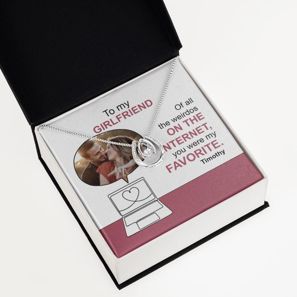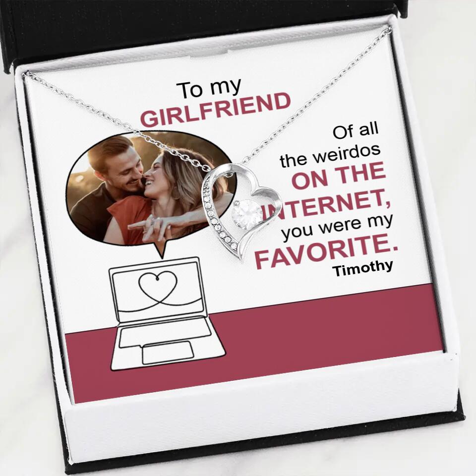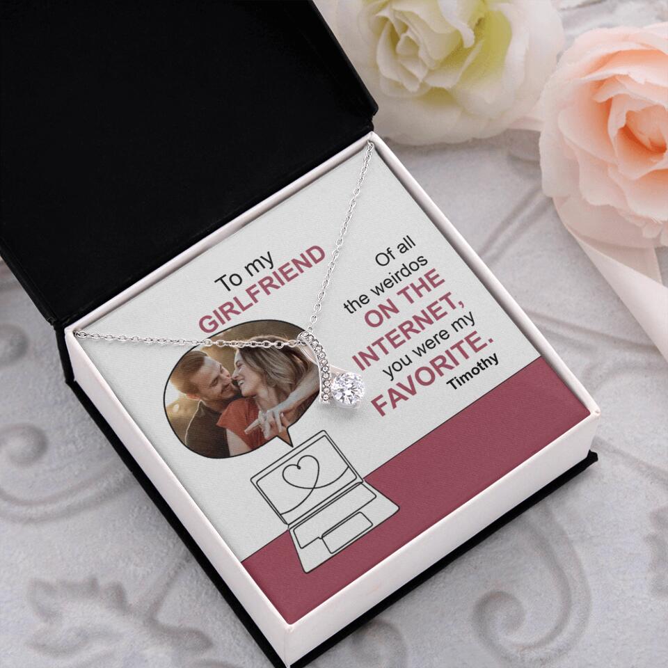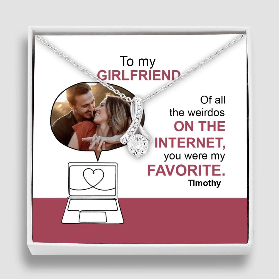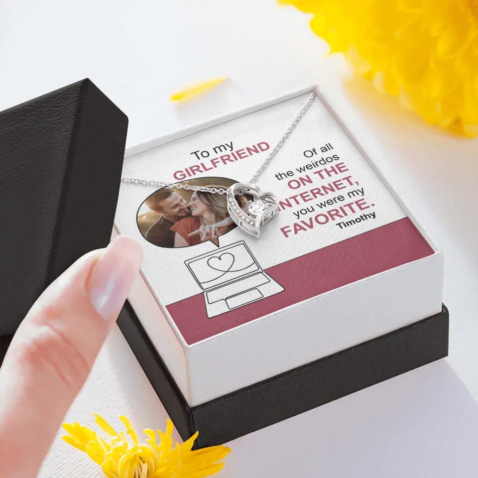 The "All of the Weirdos on the Internet, You Were My Favorite" necklace is a unique and meaningful way to show your love for your girlfriend. With its friendly and humorous design, the personalized message card accompanied by a necklace is a great way to send a unique and heartfelt message. The necklace also doubles as a stylish piece of jewelry, symbolizing the importance of this special relationship.