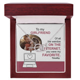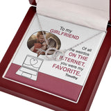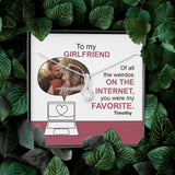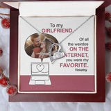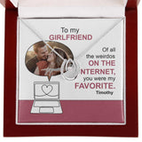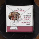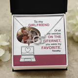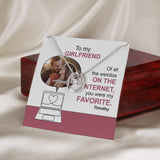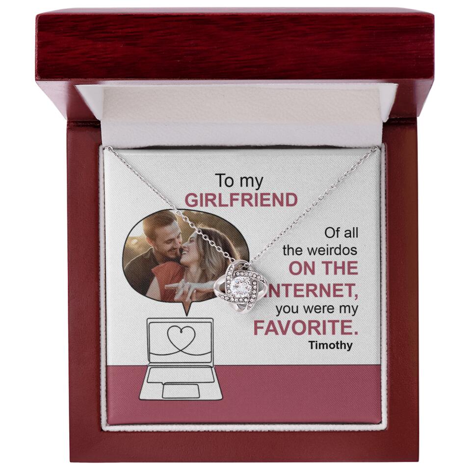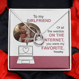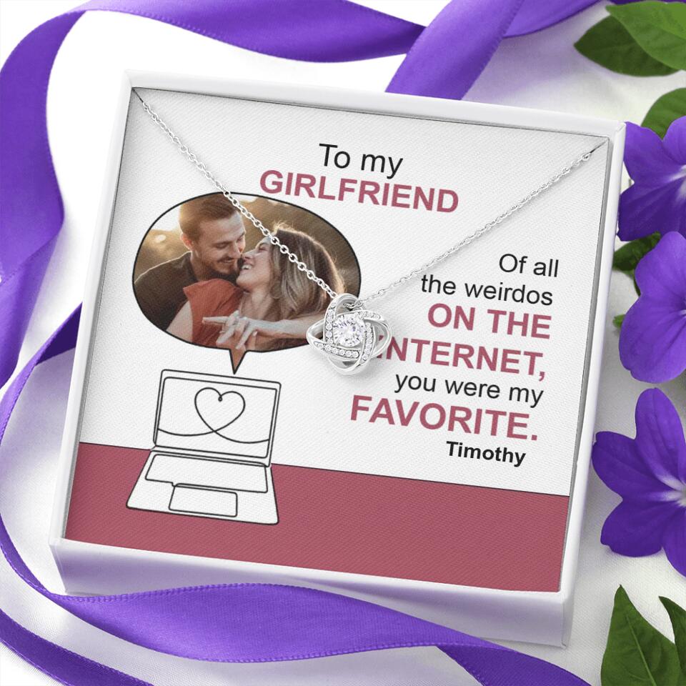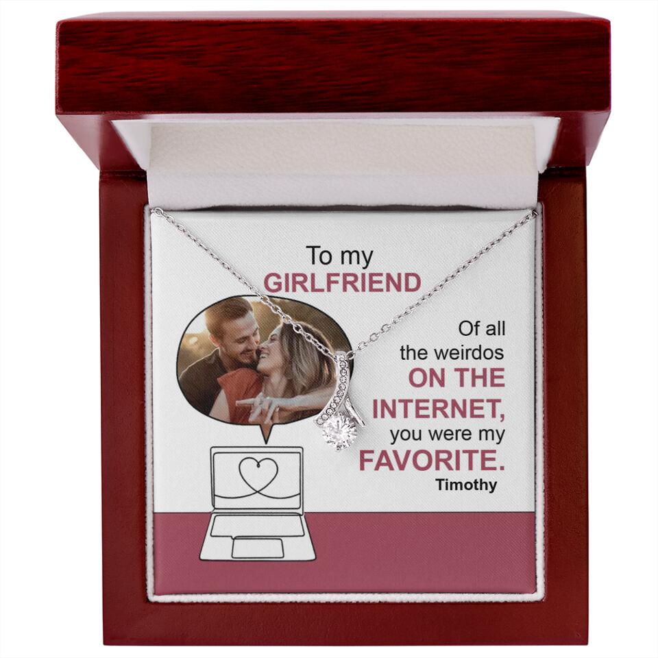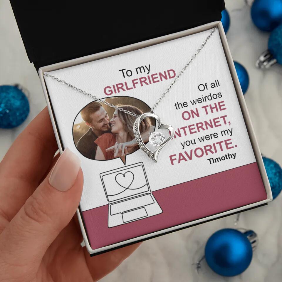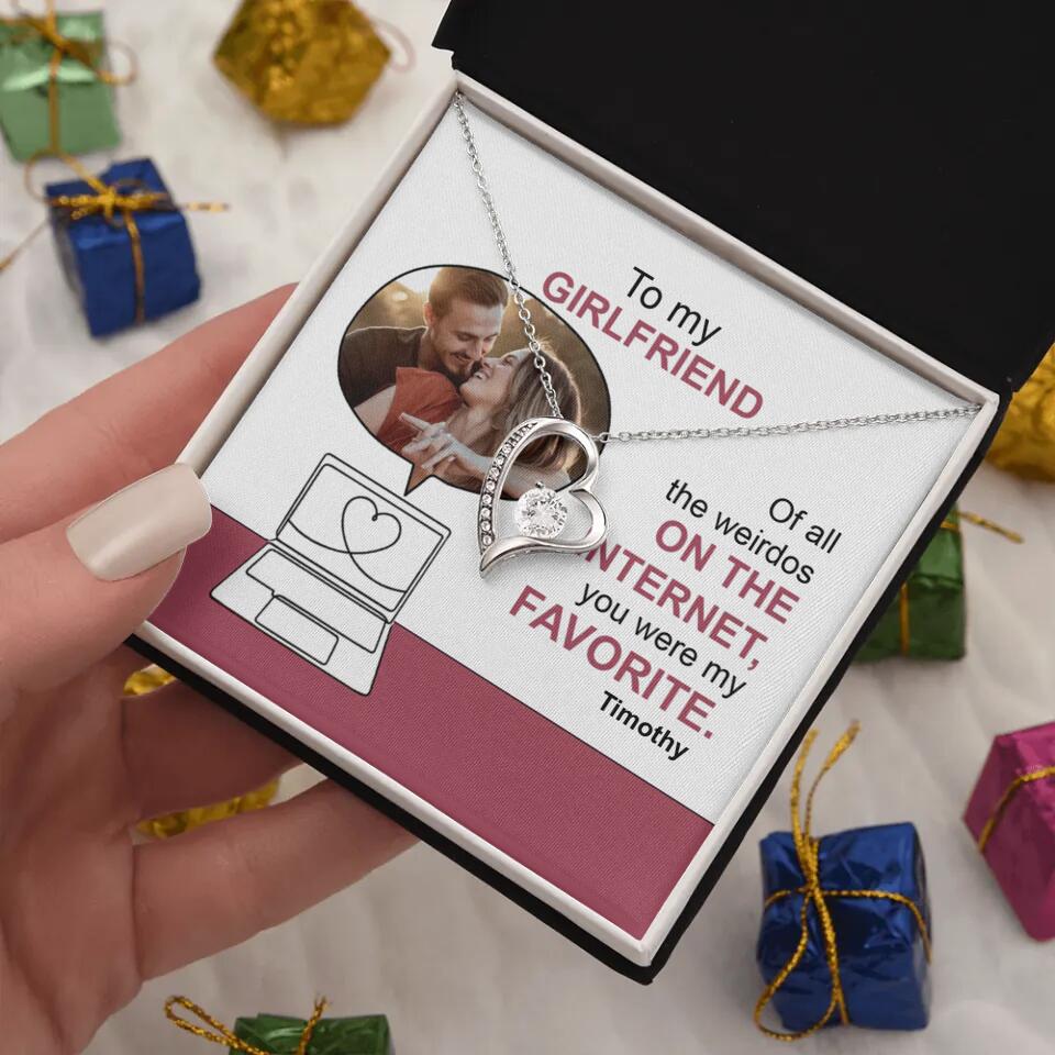 The "All of the Weirdos on the Internet, You Were My Favorite" necklace is a unique and meaningful way to show your love for your girlfriend. With its friendly and humorous design, the personalized message card accompanied by a necklace is a great way to send a unique and heartfelt message. The necklace also doubles as a stylish piece of jewelry, symbolizing the importance of this special relationship.