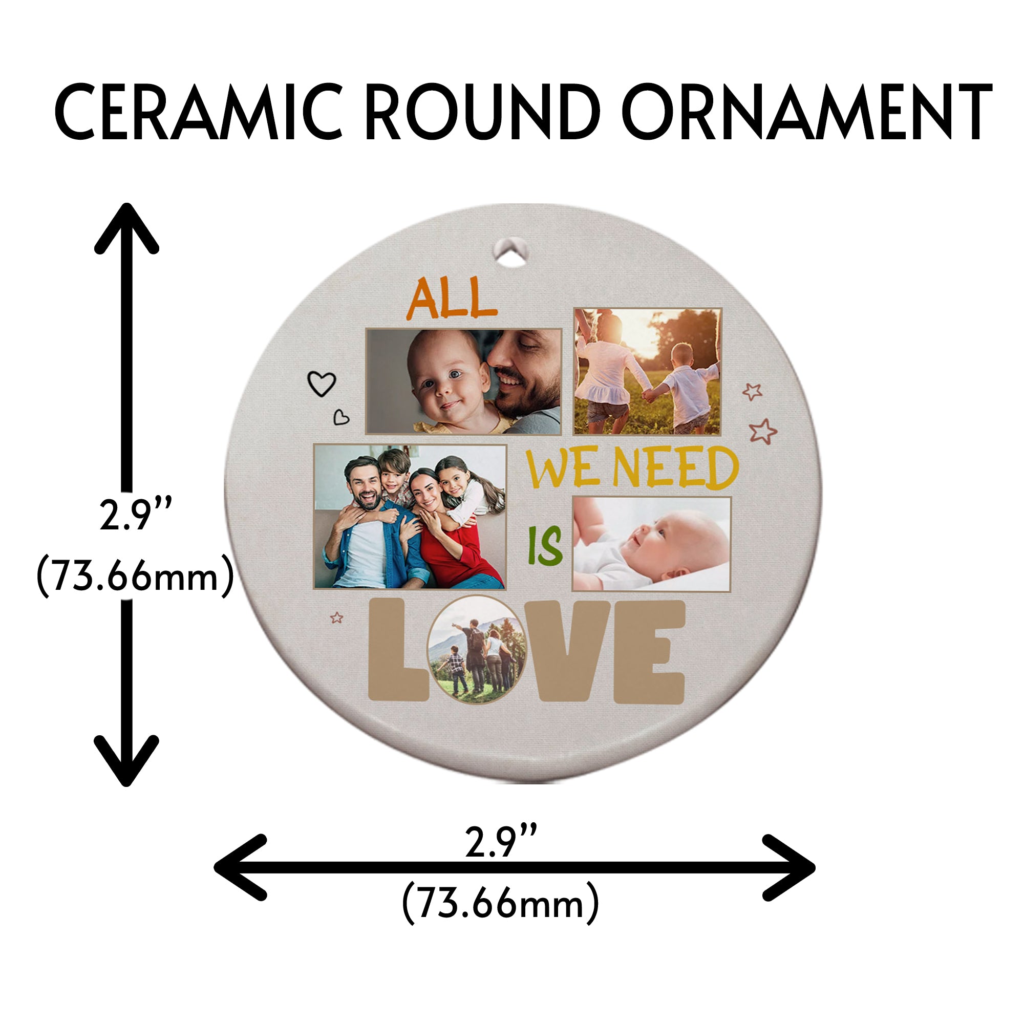 The "All We Need Is Love Custom Ornament Christmas Gift For Family" is a heartwarming Christmas gift that captures a cherished moment. This personalized ornament elegantly displays a favorite couple photo, making it a special keepsake for the holiday season. Perfect for celebrating love and togetherness, it adds a personal touch to any Christmas tree, serving as a lasting reminder of shared memories and affection.