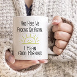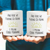 Embrace the spirit of resilience and a touch of humor with this uniquely designed mug. Perfect for those moments that require a deep breath and a little laugh, "And Here We Fucking Go Again" is not just a statement but a mantra for the unstoppable soul. Crafted to add a bit of spice to your morning coffee or evening tea, this mug is a spiritual gift that keeps on giving, reminding you to tackle life's rollercoaster with a smirk.