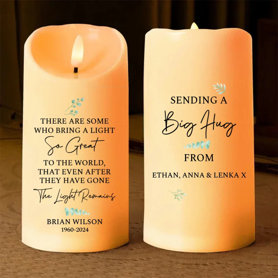 Appreciation Gift for Lost One - Sending a Big Hug - A Memorial Sympathy Gift for Appreciated Ones is a heartfelt way to offer comfort during difficult times. This personalized LED candle serves as a gentle reminder of love and support, providing solace to those grieving. Itβs a meaningful tribute that conveys warmth and remembrance, making it a cherished gift for anyone experiencing loss.