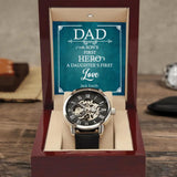 This "Dad: A Son’s First Hero, A Daughter’s First Love" personalized men's watch is an exquisite timepiece, perfect as a gift for cherished occasions like Father’s Day, birthdays, or anniversaries. The watch features a classic design with a personalized engraving that adds a unique and sentimental touch. Its quality construction ensures durability and longevity, making it not just a functional item but a potential family heirloom to be cherished over the years. This watch is ideal for any dad who appreciates thoughtful, functional gifts that carry a significant emotional value.