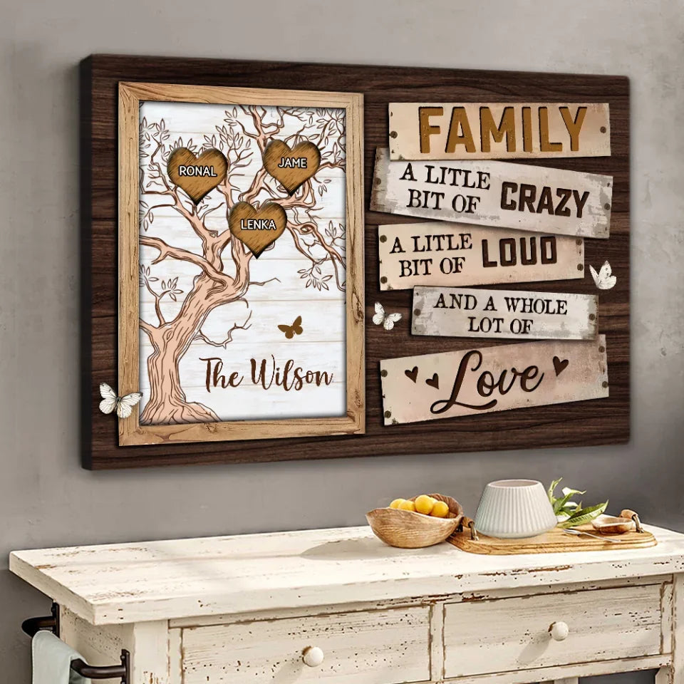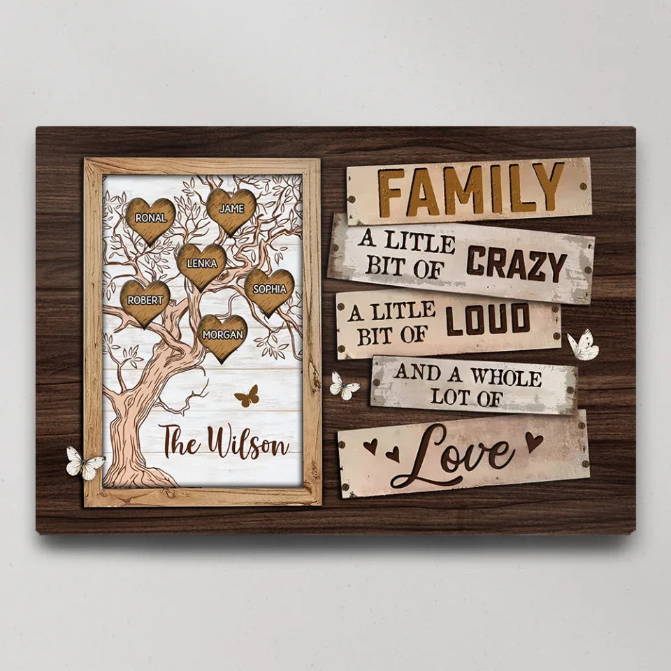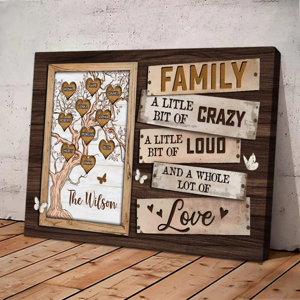 The "Family A Little Bit of Crazy Loud and Love Custom Canvas Poster" is a heartwarming housewarming gift and a thoughtful gift for parents. This personalized canvas beautifully captures the essence of family life, celebrating the love, laughter, and cherished chaos that make every home truly special.