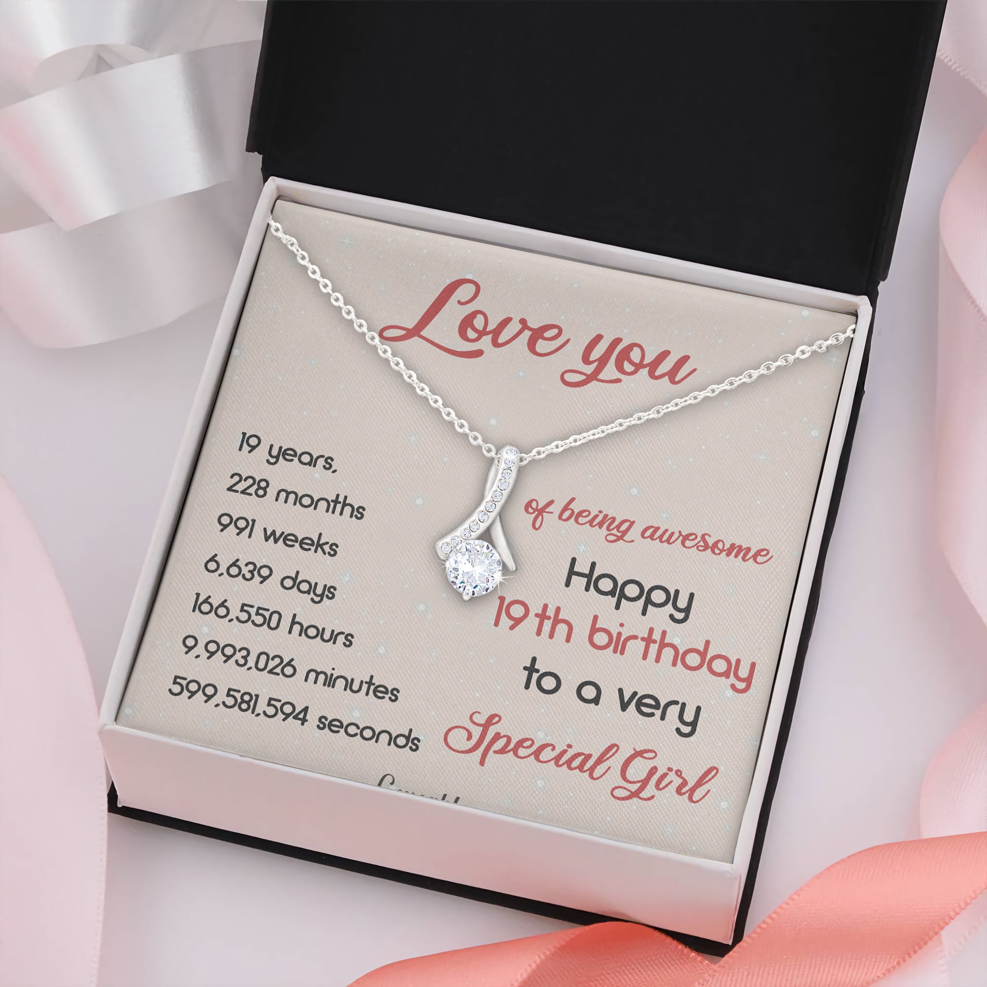 "Happy 19th Birthday Special Necklace Birthday Gift For Daughter" is the quintessential birthday gift for your daughter, celebrating her unique journey into adulthood. This gift encapsulates the joy and pride of watching her grow, tailored to make her feel cherished on her special day. It’s a thoughtful way to say 'I love you' and to honor her 19th year with a personal touch that she will treasure forever.