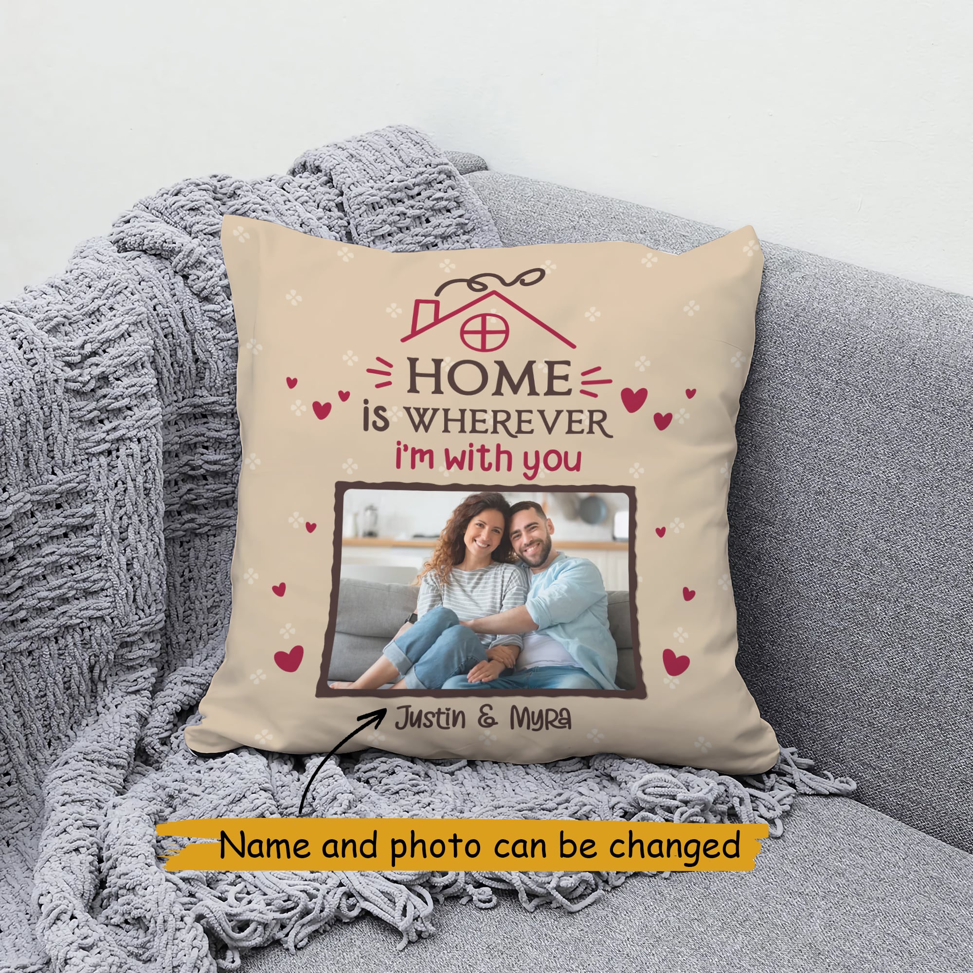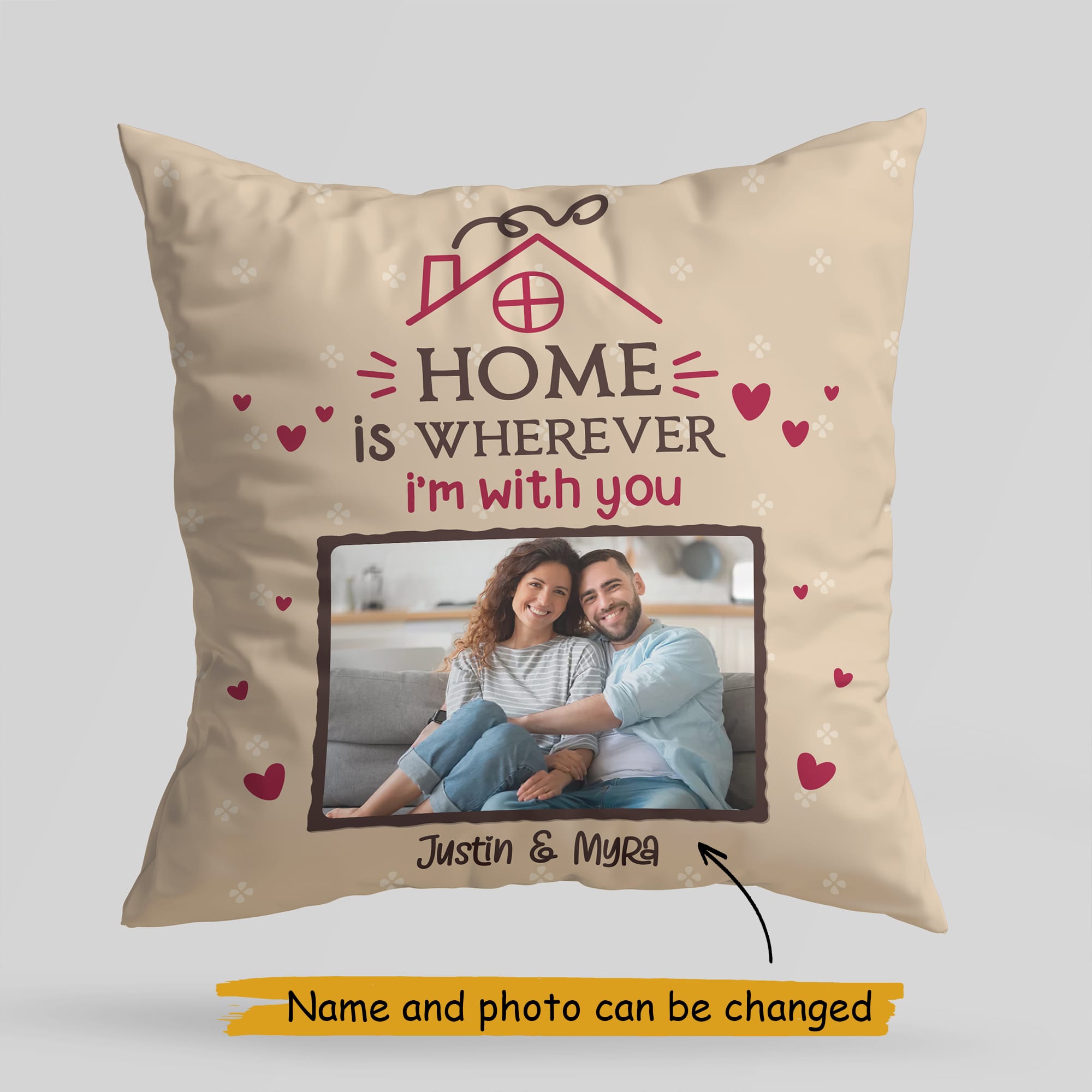 Celebrate the essence of love with the "Home Is Wherever I'm With You" personalized pillow, a heartfelt addition to any couple's home. Perfect for Valentine's Day or as a touching gift any time of the year, this pillow lets you capture and cherish your most precious moments together. Customize it with a beloved photo and names, artistically integrated into a charming house design, symbolizing that you create a home filled with love and memories.