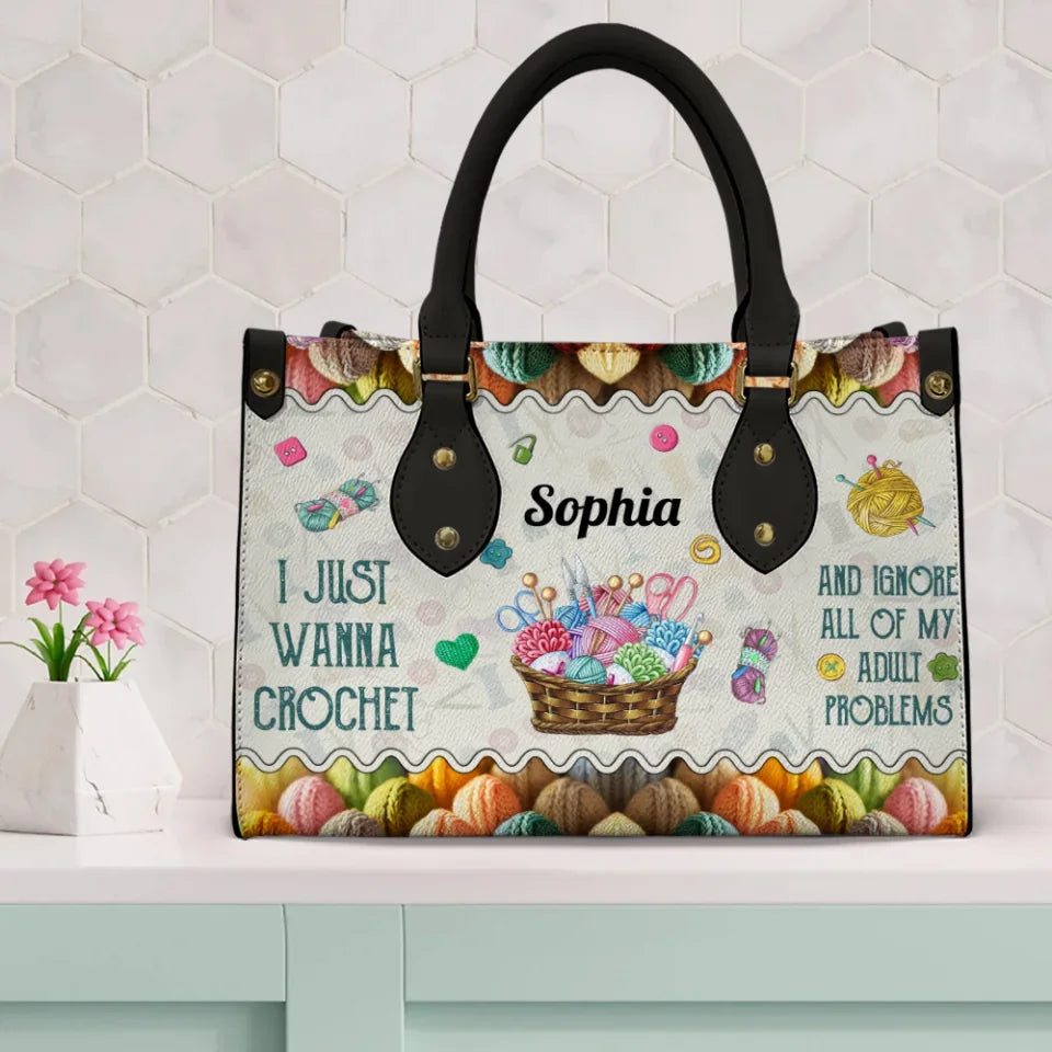 The "I Just Wanna Crochet" personalized leather handbag is a delightful and practical gift tailored for those who love crocheting. This custom handbag serves as a stylish accessory and a functional piece for carrying yarn, hooks, and other crochet essentials. Its personalized touch, with the option to add a name, makes it a unique gift that shows appreciation for the recipient's crafting passion. This handbag is perfect for crocheters who appreciate beautiful and valuable gifts, enhancing their crochet experience with a personal flair.