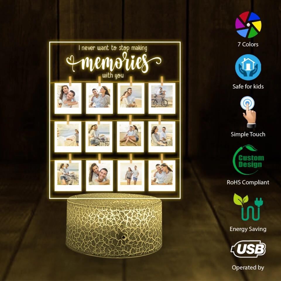 The "Never Want to Stop Making Memories with You" night light is a tender and thoughtful anniversary gift for couples. This personalized night light casts a warm, gentle glow, perfect for setting a romantic ambiance. It symbolizes a commitment to cherish and create memories together, making it an ideal keepsake that a couple can appreciate every night. Whether celebrating a milestone or just a token of enduring love, this night light adds a meaningful touch to any couple's home, reminding them of their shared journey every evening.