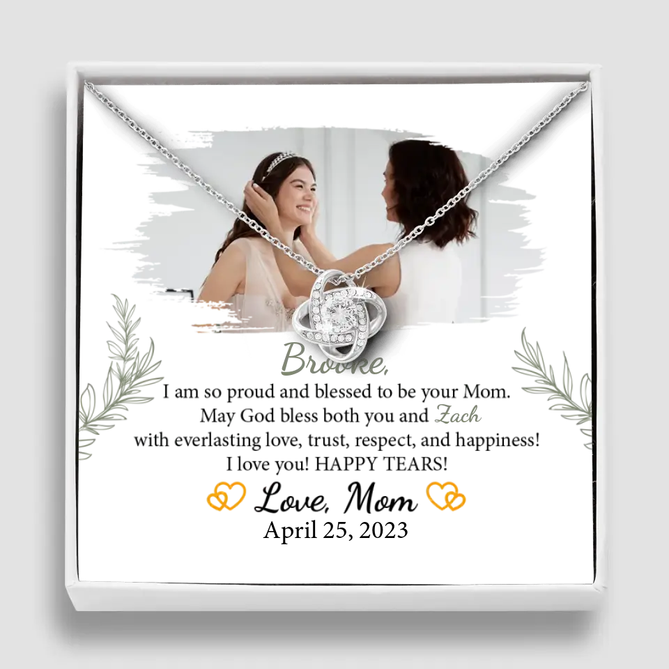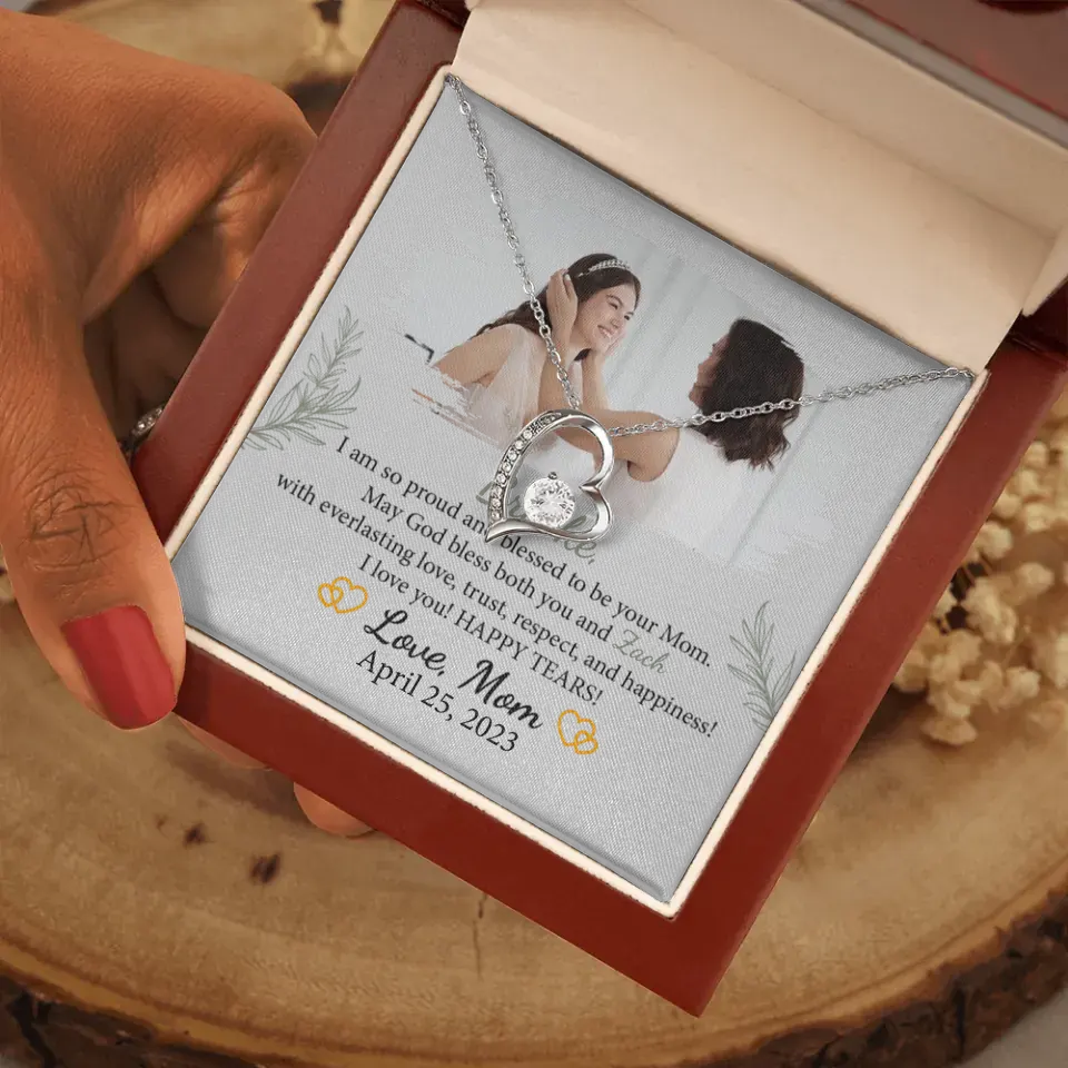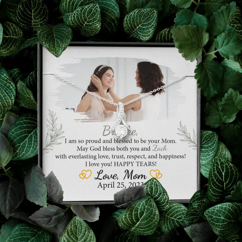 The I'm so Proud and Blessed to be Your Mom necklace is a beautifully crafted piece of jewelry, symbolizing the special bond between a mother and her daughter on her wedding day. This elegant necklace is a heartfelt expression of a mother's love and pride, making it an ideal gift for a daughter's wedding, bridal shower, or as a cherished keepsake. Personalizable with the daughter's name and the option to include a special photo, it adds a unique and sentimental dimension. Meticulously designed, this necklace is more than an accessory; it's a lasting emblem of the unbreakable maternal bond. Its timeless elegance ensures it will be treasured for years, becoming a precious reminder of love and support as she embarks on her marital journey. Every time it's worn, it will evoke cherished memories and the enduring affection of a mother for her daughter, making it a significant piece.