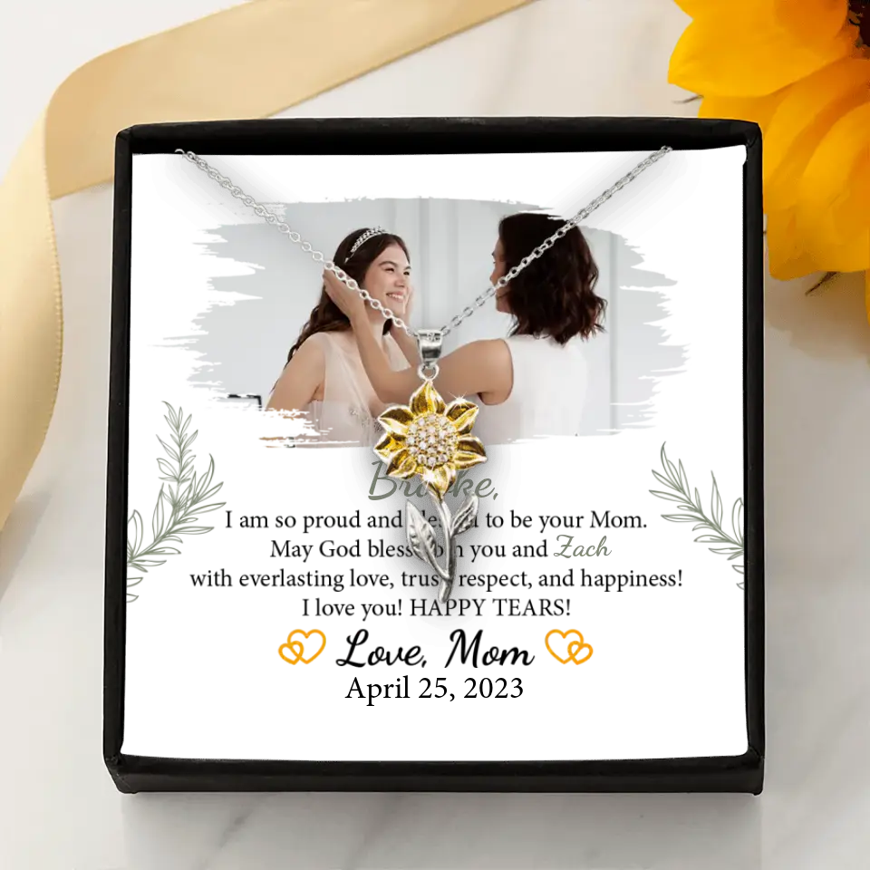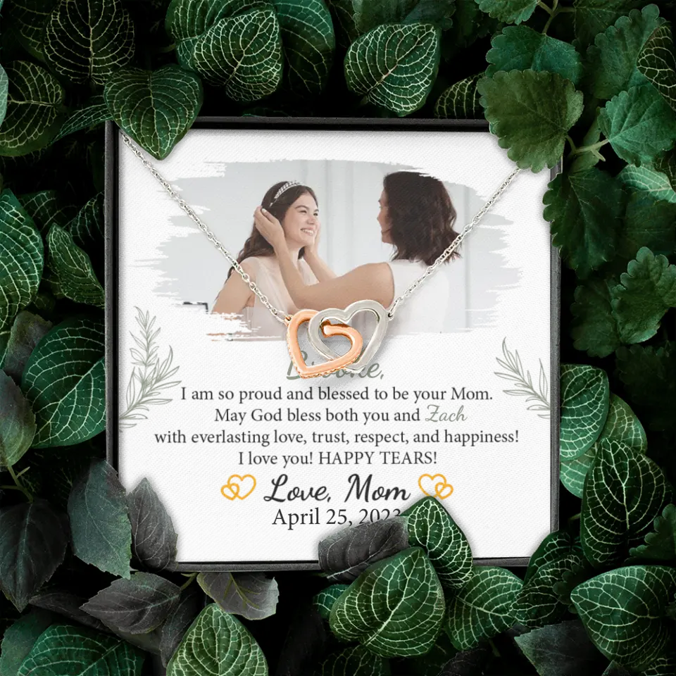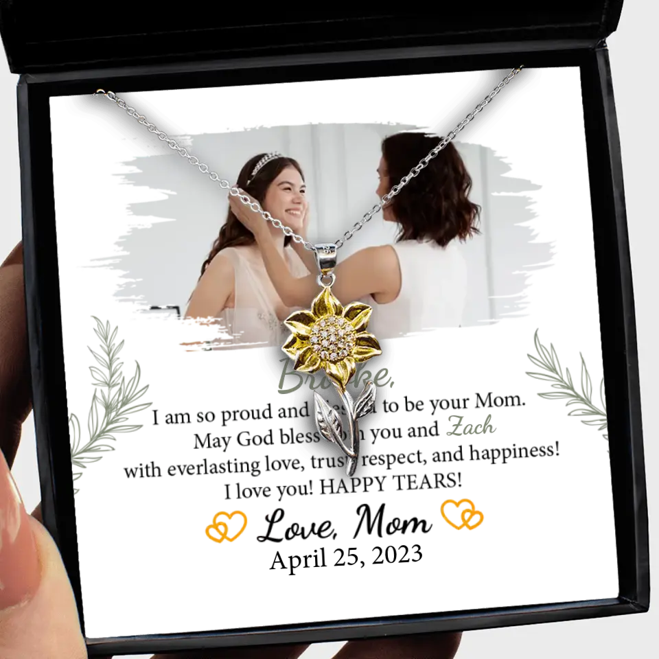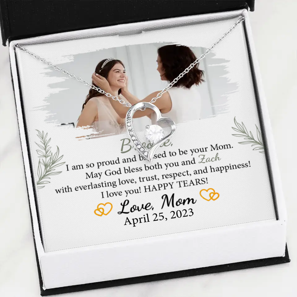 The I'm so Proud and Blessed to be Your Mom necklace is a beautifully crafted piece of jewelry, symbolizing the special bond between a mother and her daughter on her wedding day. This elegant necklace is a heartfelt expression of a mother's love and pride, making it an ideal gift for a daughter's wedding, bridal shower, or as a cherished keepsake. Personalizable with the daughter's name and the option to include a special photo, it adds a unique and sentimental dimension. Meticulously designed, this necklace is more than an accessory; it's a lasting emblem of the unbreakable maternal bond. Its timeless elegance ensures it will be treasured for years, becoming a precious reminder of love and support as she embarks on her marital journey. Every time it's worn, it will evoke cherished memories and the enduring affection of a mother for her daughter, making it a significant piece.