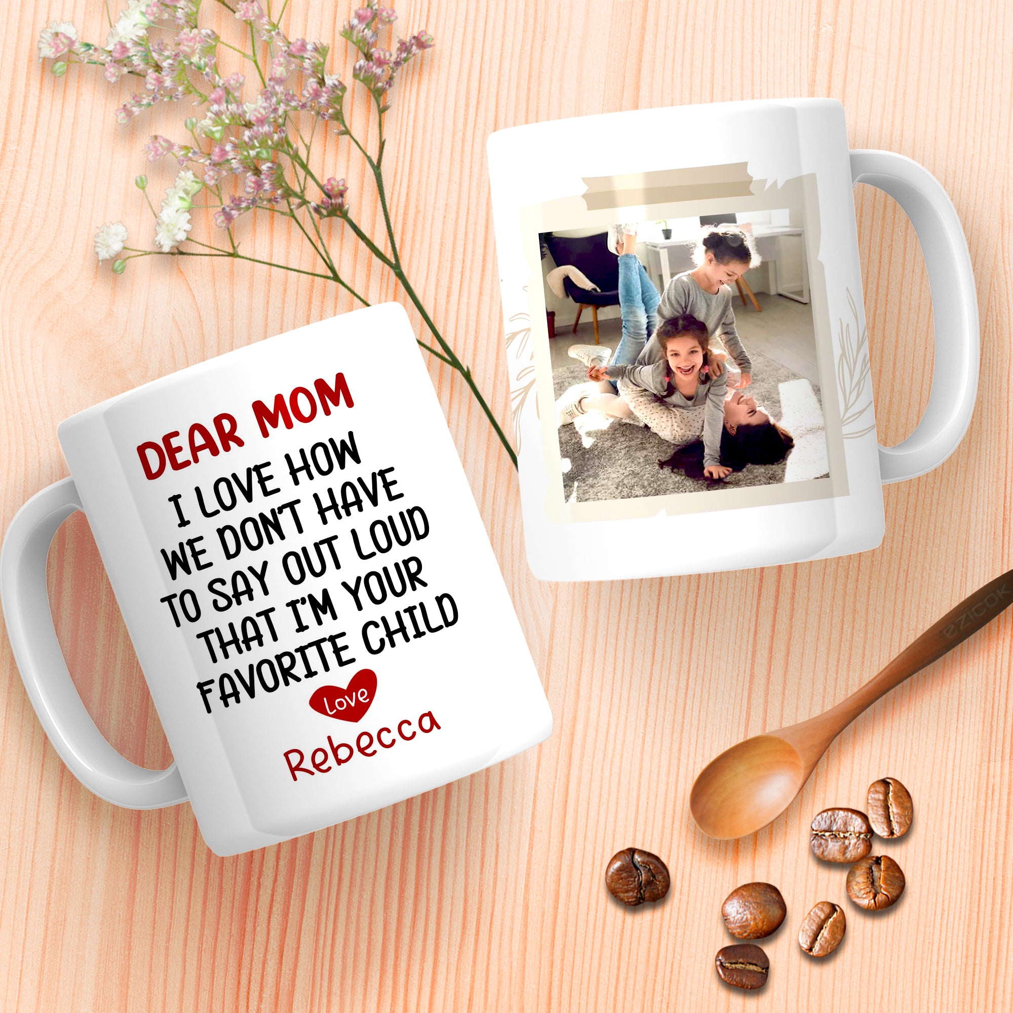 I'm Your Favorite Child Custom CERAMIC MUG is the perfect mom gift from kids, offering a heartfelt touch to her daily routine. This personalized mug, featuring a cherished photo, adds a unique and playful element to her coffee or tea time. Celebrate the special bond between mother and child with this delightful and memorable gift that she'll treasure every day.