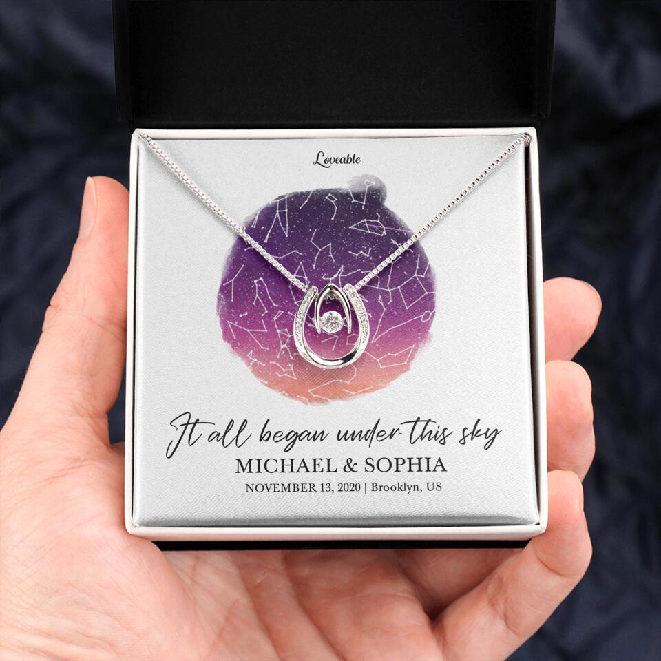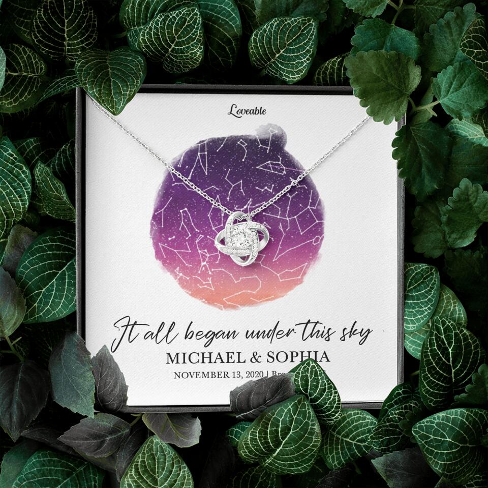 Capture her heart with the elegance and allure of the "It All Began Under This Sky" necklace, a mesmerizing gift perfect for anniversaries, birthdays, Christmas, or Valentine's Day. With its ribbon-shaped pendant, this exquisite piece exudes sophistication and grace, making it an unforgettable symbol of your affection. Drenched in the glow of 14K white gold and adorned with the sparkle of clear crystals, it centers around a captivating cubic zirconia, promising to illuminate her every moment. Its versatile design complements any outfit, from daytime elegance to evening glamour.