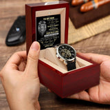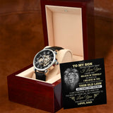 Gift a touch of elegance and timeless sentiment with the "Lion To My Son" Luxury Men's Watch. This exquisite timepiece is not just a watch; it's a reminder of your unwavering love and belief in him. Perfect for any adult son, nephew, fiancé, dad, or grandpa, it symbolizes strength and guidance through its unique lion engraving. The watch boasts a genuine leather strap and a skeleton dial that showcases the intricate inner workings, offering both style and a peek into the heart of precision. Encased in a mahogany-style luxury box with an LED spotlight, it's ready to be the most meaningful gift he'll ever receive.