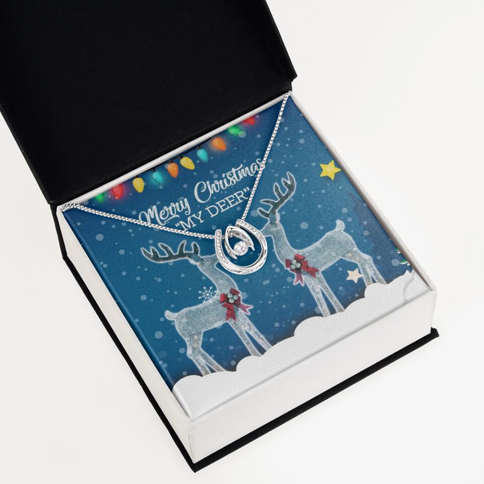 The "Merry Christmas My Deer" necklace is a beautifully crafted jewelry piece, perfect as a Christmas gift for a special woman in your life, be it your wife, mother, or girlfriend. It features a stunning design with a central crystal, adding an elegant touch to any outfit. This necklace is not just a piece of jewelry but a token of love and appreciation, making it an ideal gift to convey warmth and affection during the holiday season.