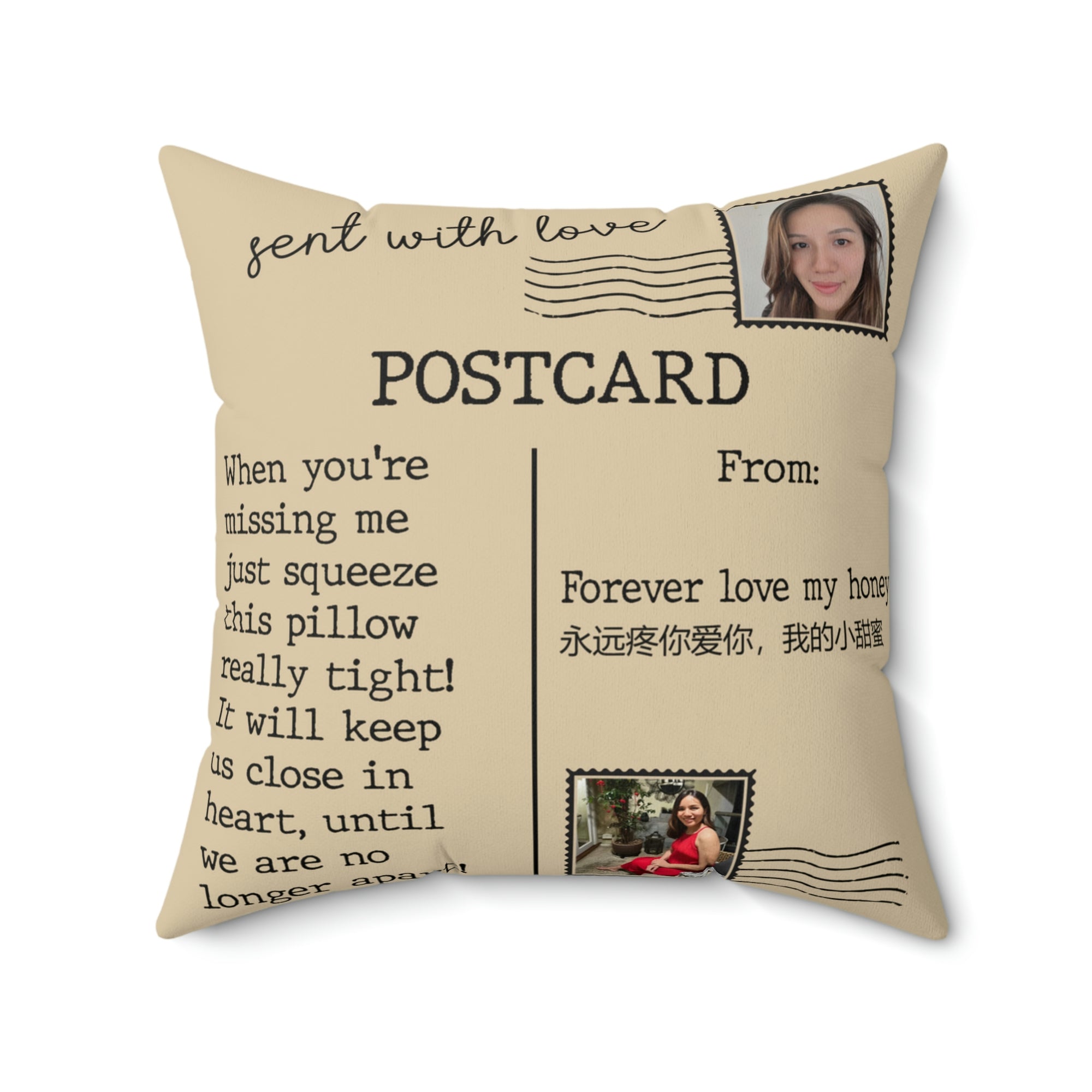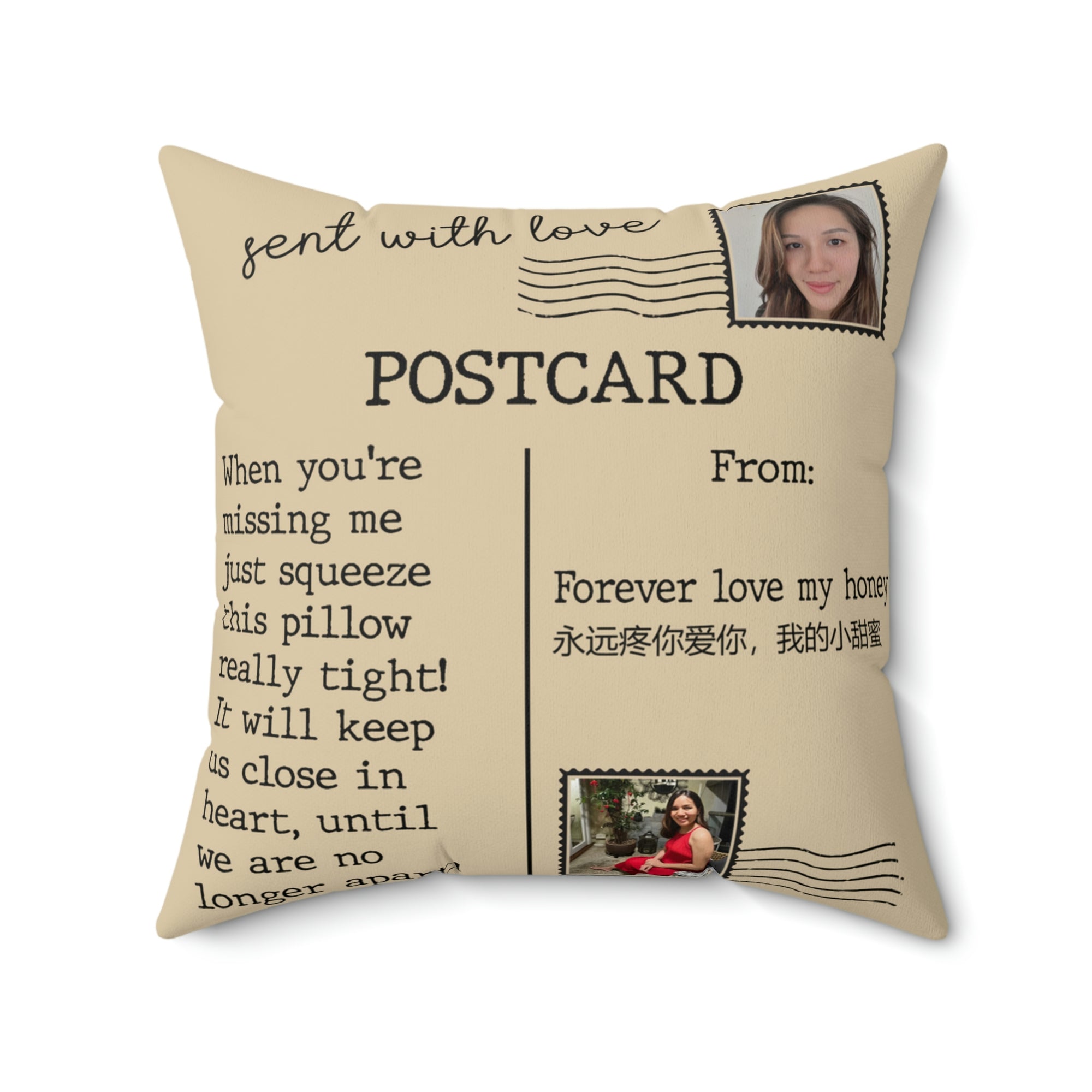 The "Sent With Love Postcard" Pillow is a beautifully designed gift for her, encapsulating warmth and personal sentiment as a cozy pillow. This thoughtful present can constantly remind you of affection and connection, perfect for expressing love, gratitude, or just because. It's a unique way to send a hug and a message of love, ideal for someone special.