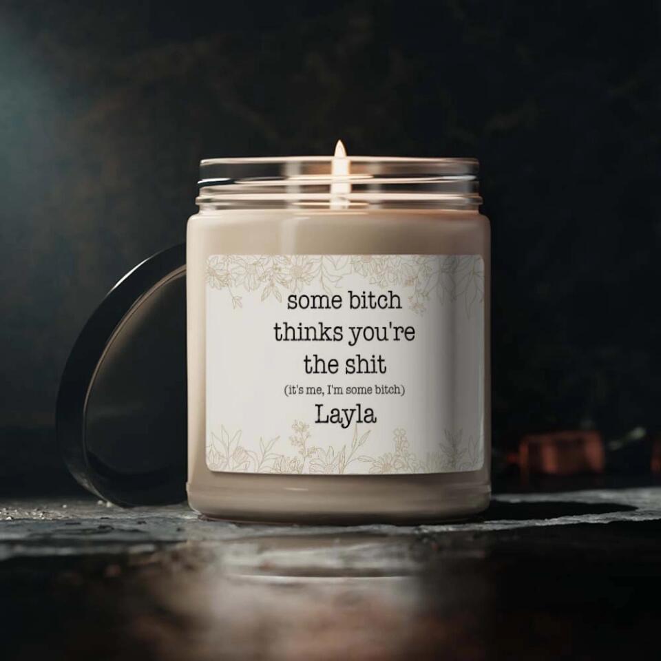 The "Some Bitch Thinks You're The Shit Custom Candle Funny Gift For Friends" personalized scented candle is the perfect blend of humor and warmth, making it an exceptional gift for friends. Ideal for birthdays or any occasion, this candle brings a smile with its playful message while adding a touch of personalized charm to any space. It’s a thoughtful way to celebrate friendship and show you care in a fun, memorable way.