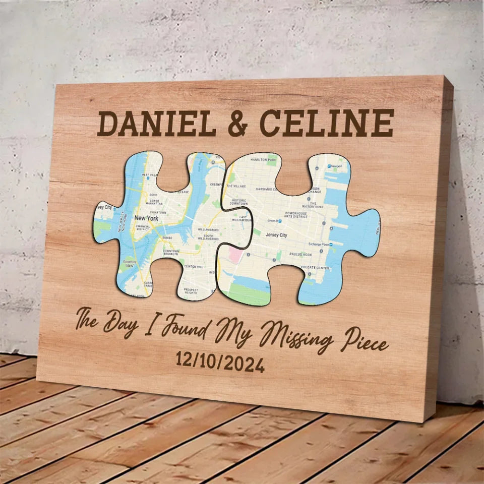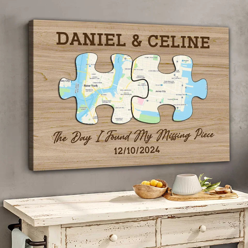 "The Day I Found My Missing Piece Custom Puzzle Map Canvas Poster" is a beautiful and meaningful way to celebrate love and connection. Perfect as a gift for couples, this custom map captures the moment two hearts found each other. It's an ideal anniversary gift that will hold special memories for years to come.