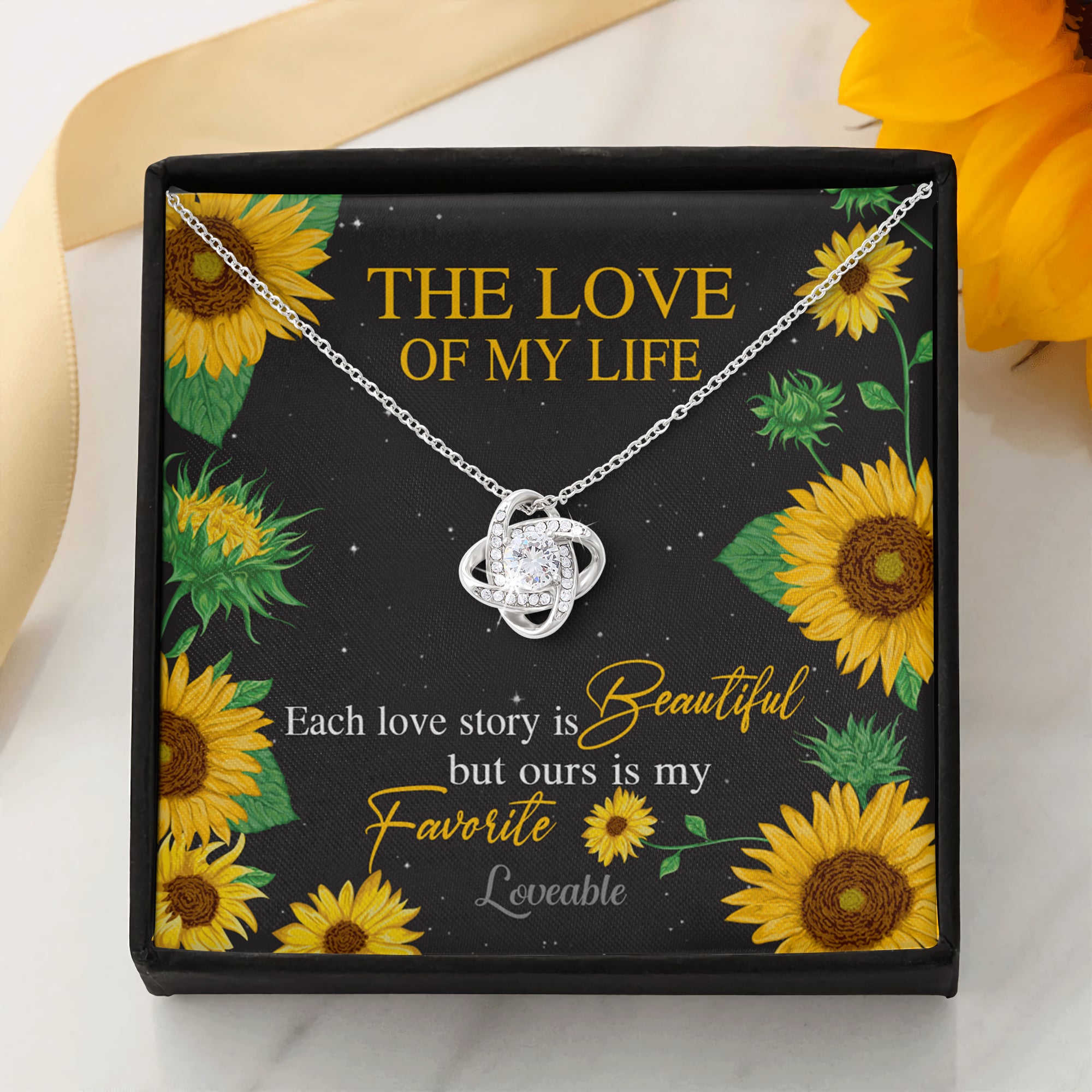 The "Love of My Life" Love Knot Necklace is a stunning gift for your wife, symbolizing your unbreakable bond and eternal love. This beautifully crafted necklace features a timeless love knot design, making it a perfect token of affection for anniversaries, birthdays, or to say "I love you." It's elegance, and meaningful symbolism will remind her daily of your deep connection, making it not just a piece of jewelry but a treasured keepsake that celebrates your journey together.
