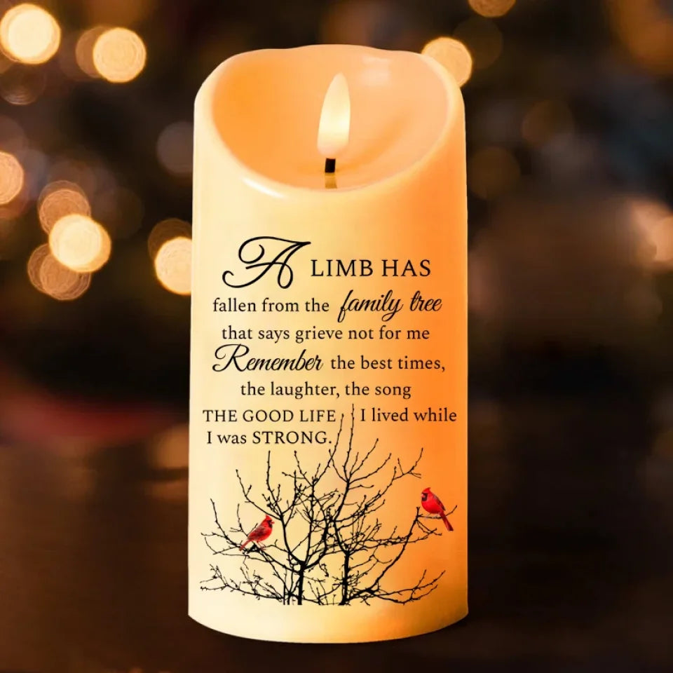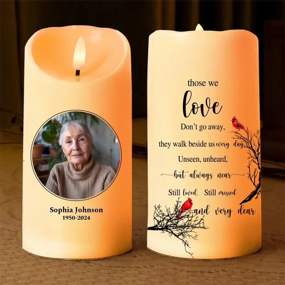 Those We Love Don't Go Away - They Walk Beside Us Every Day - Cardinal Memorial LED Candle is a heartfelt tribute designed to provide comfort during times of loss. This soothing LED candle serves as a thoughtful gift for the loss of a mother or the loss of father, making it an ideal sympathy keepsake. Its gentle glow and comforting message create a serene ambiance, reminding loved ones they are always near.