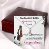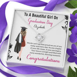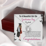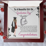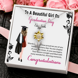 The "To a Beautiful Girl on Graduation Day" Necklace is a touching graduation gift for a daughter or sister, designed to celebrate her achievements and the exciting journey ahead. This exquisite necklace carries a heartfelt message that will remind her of her special day and your pride in her accomplishments. Crafted with care, it is a stylish accessory that she can wear as a symbol of her hard-earned success. Whether she's stepping into further education or starting a new career, this necklace is a beautiful way to show your support and love.