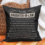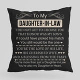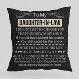 To My Daughter-In-Law - Sqaure Pillow is a heartfelt expression of love and acceptance that beautifully captures the bond between a mother-in-law and daughter-in-law. This charming pillow makes a perfect gift for a daughter-in-law from a mother-in-law, adding a personal touch to her home decor while serving as a constant reminder of your special relationship.