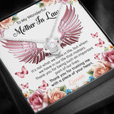 This necklace is a special way to show love to your mother-in-law. It's made with a shiny design and a little sparkly stone, making it perfect for Mother's Day, anniversaries, or just to say thanks. It's durable and meant to be kept for a long time, showing how much you appreciate her.