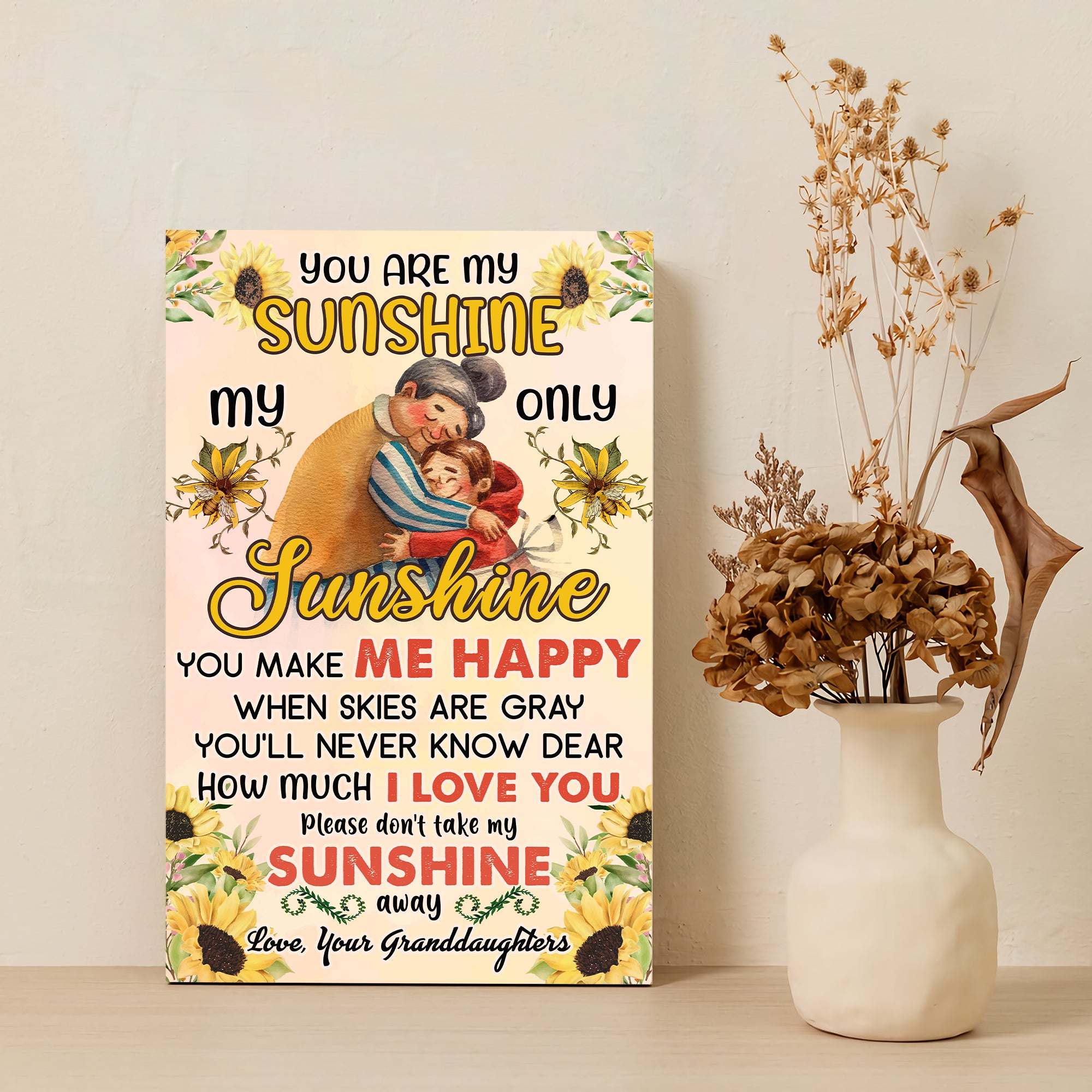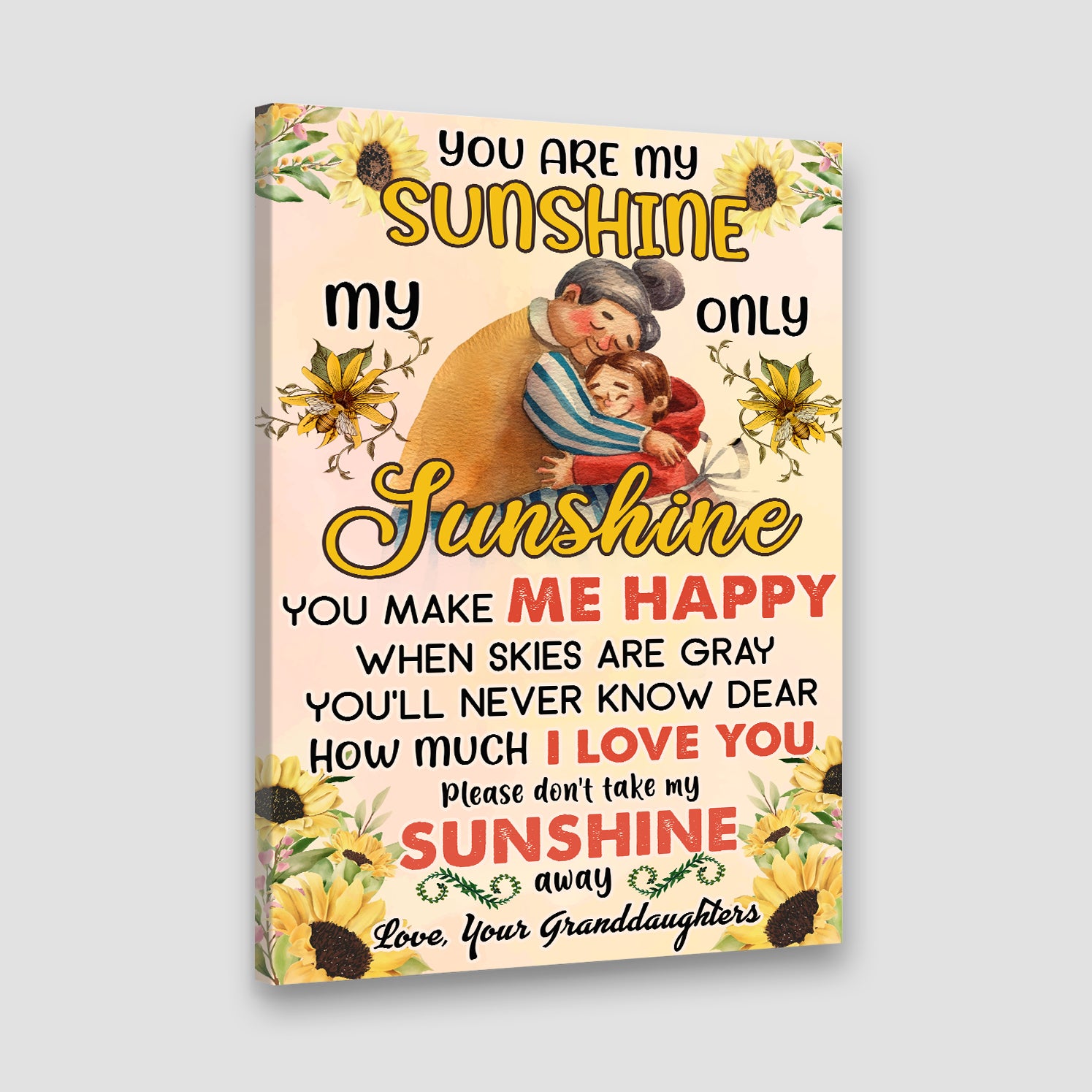 You're My Sunshine, My Only Sunshine CANVAS/POSTER is a radiant gift for Mom or Grandma, beautifully capturing the warmth and love they bring into your life. This stunning piece features vibrant, full-color artwork that brightens any room, making it a perfect addition to their home decor. It's not just a gift; it's a heartfelt reminder of the joy and light they represent, ideal for any occasion to show your appreciation.